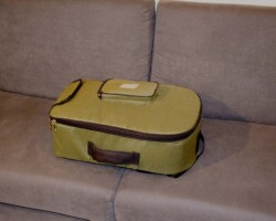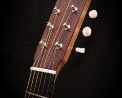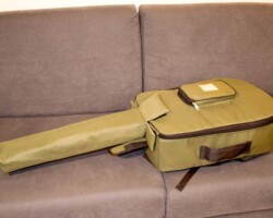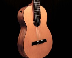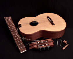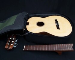 This travel guitar is built with the same adjustable system as Stauffer, plus a fitting that allows the headstock to be easily removed and replaced. This way, it can be stored in a case that fits into carry-on luggage. The case is designed to transport the guitar either assembled or disassembled.