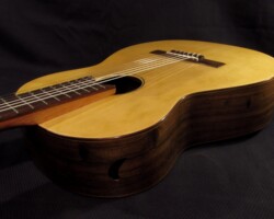 This is a guitar inspired by the designs of luthier Thomas Humphrey with the addition of the adjustable and removable neck system manufactured in Vienna at the beginning of the 19th century by luthier Johann Stauffer. The system not only allows to remove the handle of the guitar, but also makes it possible to adjust the string height in a very simple way according to the guitarist’s taste.