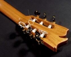 This guitar, also inspired by the designs of luthier Thomas Humphrey, has an elevated neck (Millennium neck) and different from Humphrey’s guitars, this model has no heel, which allows greater comfort when playing beyond the twelfth fret. This idea of eliminating the heel is taken from the Argentine luthier Ricardo Louzao who devised these handles for his guitars.